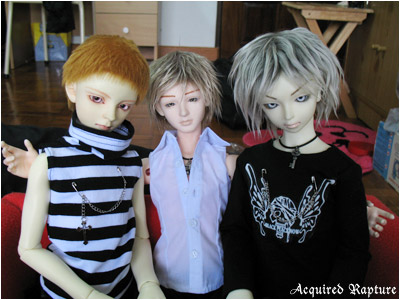 | Mars wanted to see all the striped shirts together. We'd got the shirts as Razkil's birthday present. ^_^ (Well, Iksir has on an old top; Yuki was supposed to be in the picture, but Mars had wanted Iksir instead. ^_^;)