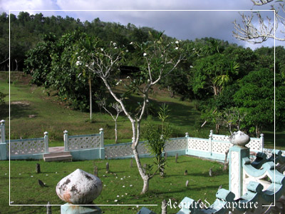 If you turn around, here's the view. The fort is just in front of us. And that frangipani tree middle of all the graves... I have stories about that. *laughs* They seem to always be found in the graveyards. And in ghost stories, when you smell frangipani, you know something's near... *laughs* Admittedly, as we were walking around, I had been smelling the flowers and found that it fit the place, though I didn't get any feeling of er...fear. *grin* Luckily. ^_~ But still though, if I smell frangipani and can't find the source, it does freak me out a bit. ^_^;; But like the prudent reader of ghost stories, I'll not mention it to anyone in case something _is_ there and decides to appear. ^_^;;