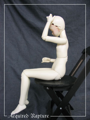 Sitting upright. The upper torso been pulled up onto a ledge at the back of the lower torso.