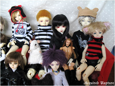 | Here's the whole gang, minus a couple of heads and some Unoa faceplates. *grin* We have a total of 15 resin ball-jointed dolls. Ferrahn and Errand aren't included in the count. And neither are Luthien and Evien's cats, and our other Neo Go Guys who aren't in the picture.
