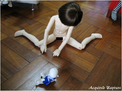 | Apparently, he'd been teaching Shy how to stretch... Though we wonder why he'd wanted to do it naked. *falls over* Shy's lil Latidoll White body does pose pretty well despite its size and Mars seemed to enjoy playing with it.