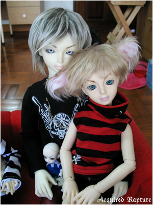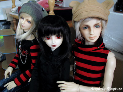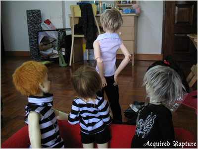 | Mars wanted to see all the striped shirts together. We'd got the shirts as Razkil's birthday present. ^_^ (Well, Iksir has on an old top; Yuki was supposed to be in the picture, but Mars had wanted Iksir instead. ^_^;)
