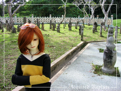 If you turn around, here's the view. The fort is just in front of us. And that frangipani tree middle of all the graves... I have stories about that. *laughs* They seem to always be found in the graveyards. And in ghost stories, when you smell frangipani, you know something's near... *laughs* Admittedly, as we were walking around, I had been smelling the flowers and found that it fit the place, though I didn't get any feeling of er...fear. *grin* Luckily. ^_~ But still though, if I smell frangipani and can't find the source, it does freak me out a bit. ^_^;; But like the prudent reader of ghost stories, I'll not mention it to anyone in case something _is_ there and decides to appear. ^_^;;