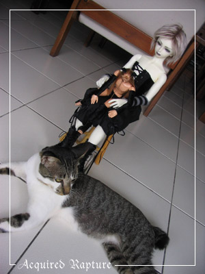 A rather random collection of pictures taken 30th Jan 2005. Mutual pets. Both act as if they're master of each other.> "Don't bother him, Ferrahn." "Ferrahn, leave Feyn's lacings alone." next page