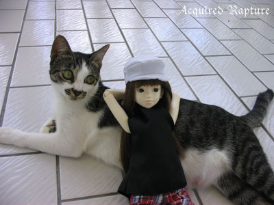 Nothing to do around the house... Khairi trying on Rhia's wig. The cat doesn't seem impressed. But she makes a good cushion. ^_^ Ahh! Where's my hat?! Yes, that's it. I did say it was a lazy day. ^_~