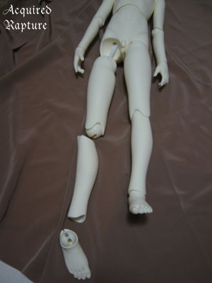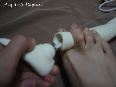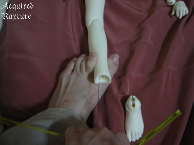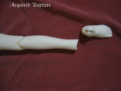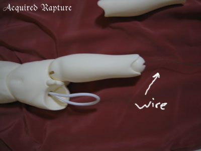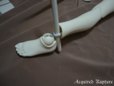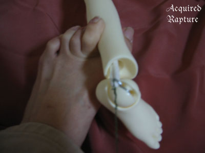 Now that the foot's hook is inserted, I just twist the wire around the elastic string off and the tension of the elastic will snap the foot in place. *_*