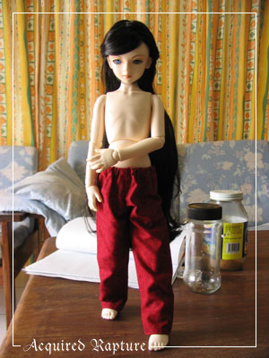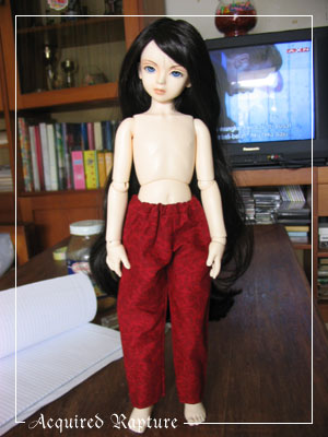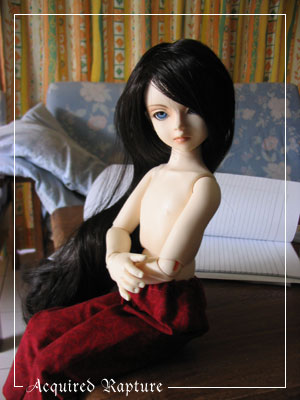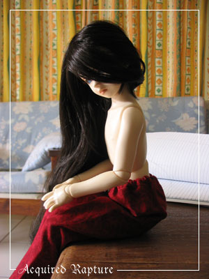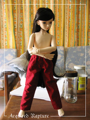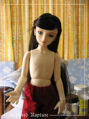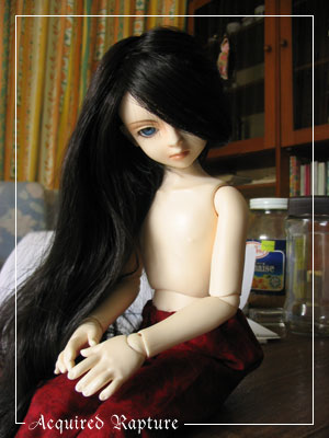 The MSD body is crafted in such a way that sitting is either leaning back on their hands, or being propped up against something. Unlike the Unoa which have a sort of wedge at the back of their thigh joints to facilate holding the thighs in a 90 degree angle to the torso, the MSD thighs are all smooth. Sitting upright unaided is not a possibility at all. -_- A body that isn't able to sit up straight is pretty much useless--and pathetic. So we got out our coated wire and wired Kamahn's body.